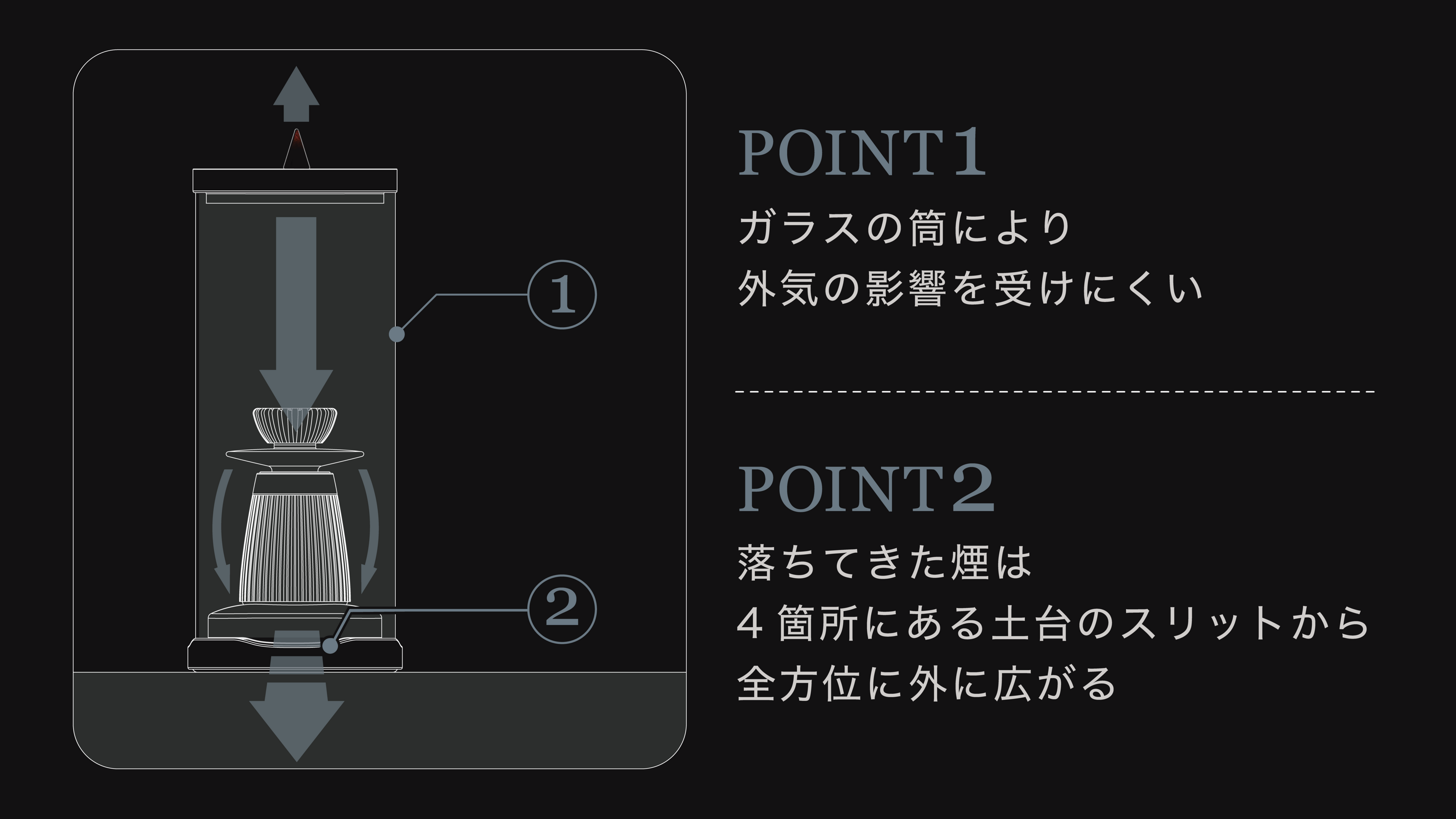 流れ落ちる煙と深い香りの広がりをご堪能ください。時間の経過とともに流量が変化し、様々な煙の表情が楽しめます。