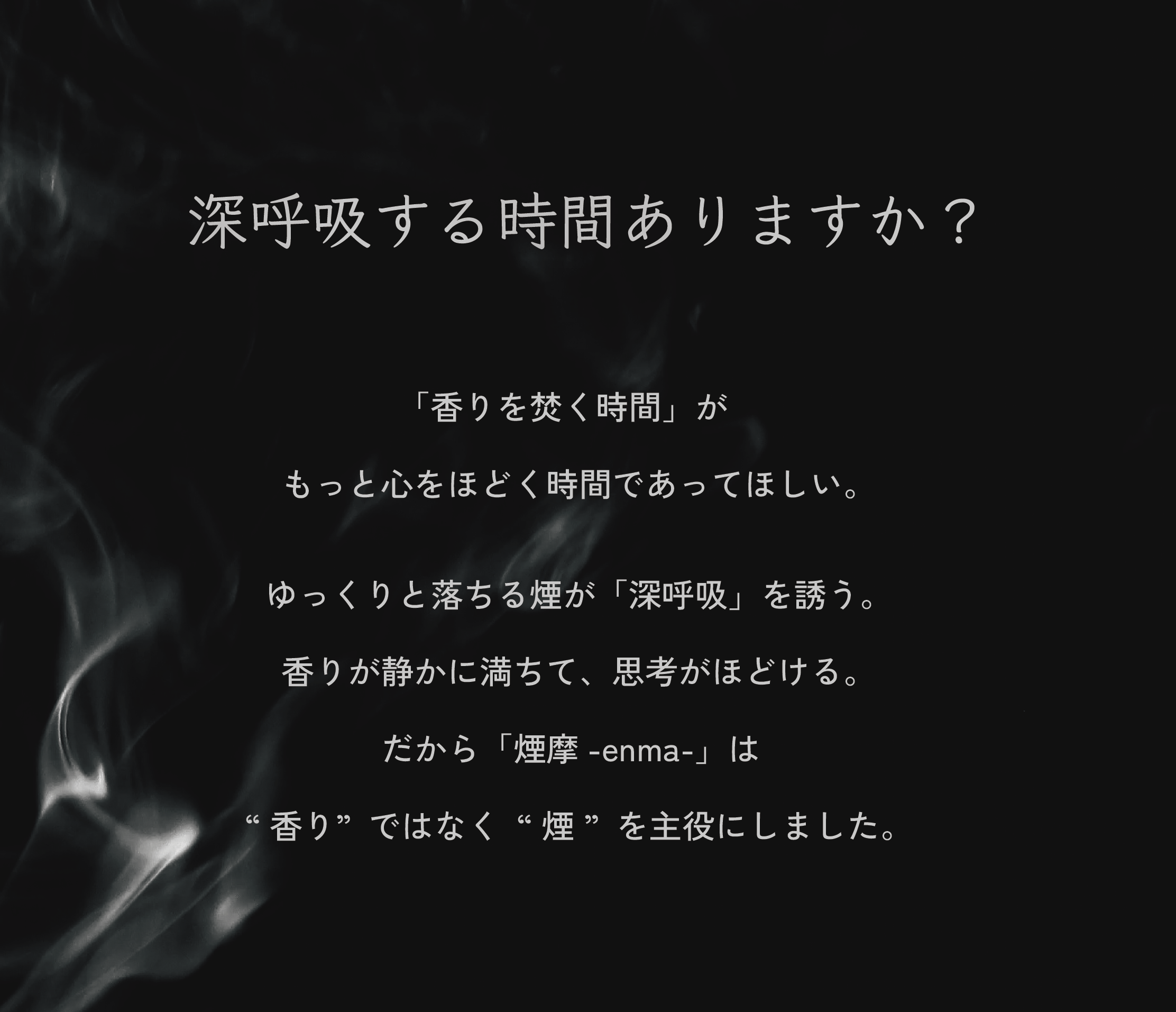 ・お香が生み出す煙は繊細です。本ページの煙の流れは一例であり、使用環境によって異なる動きを見せることがあります。